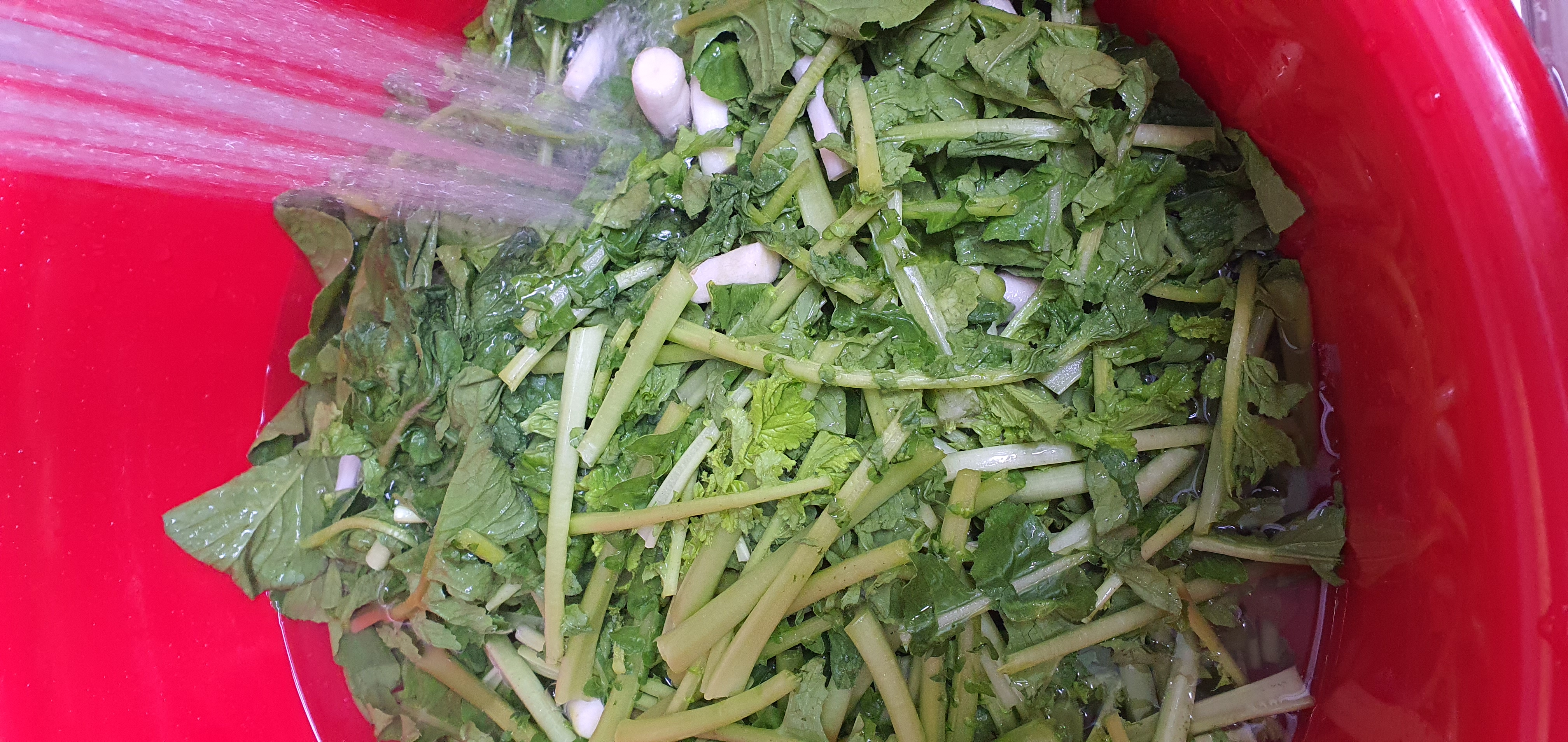 시든 잎을 떼고 열무를 깨끗하게 씻어 5cm 정도로 썰어줍니다.