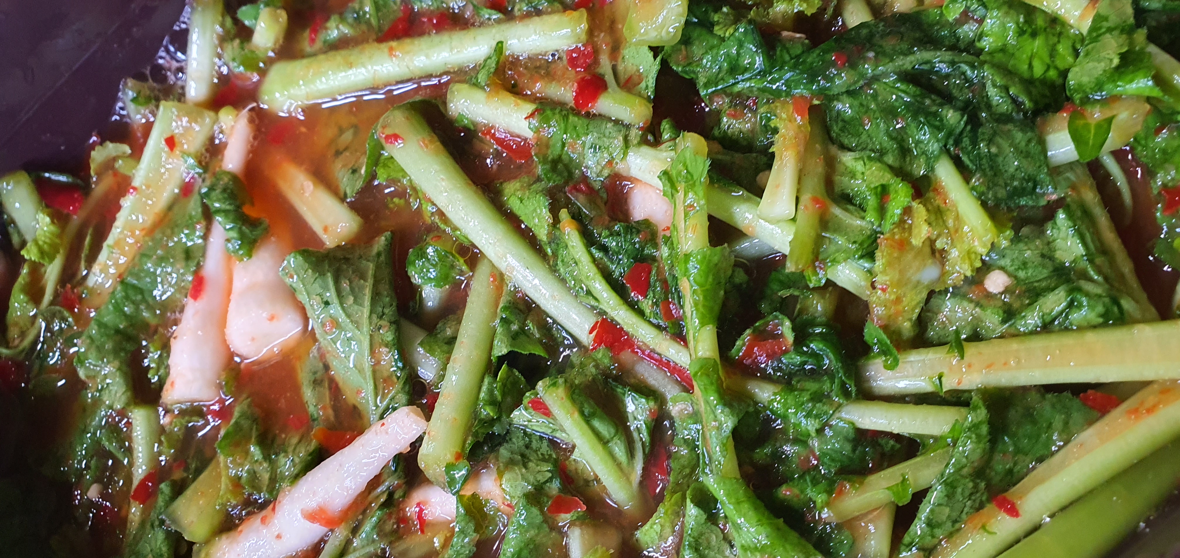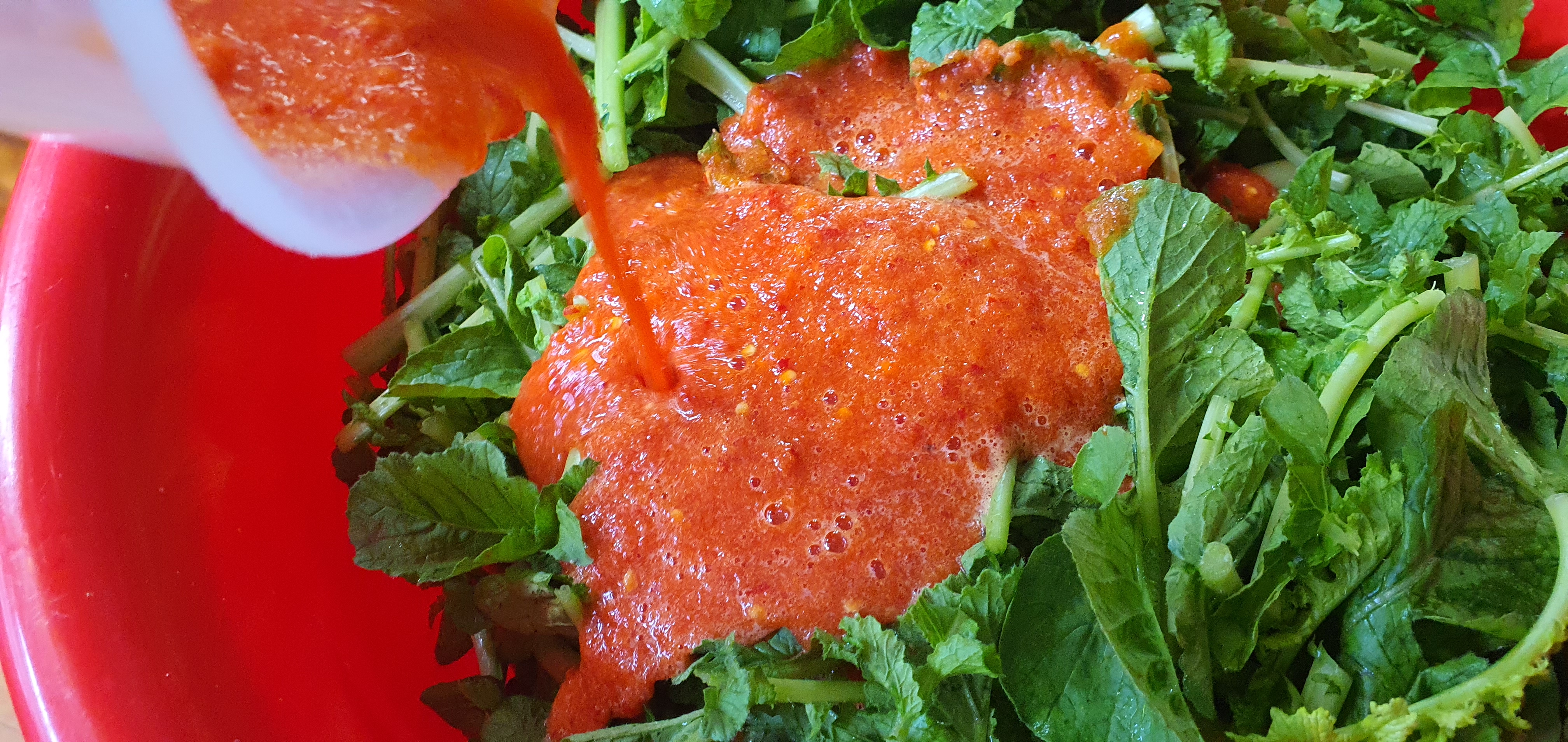 3. 열무 위에 양념 붓기